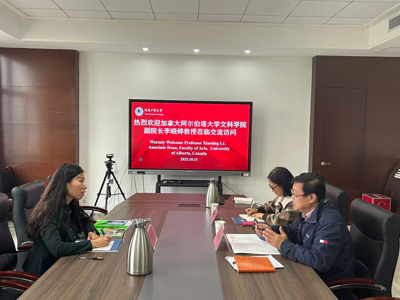 10月11日上午,加拿大阿尔伯塔大学文科部副部长李晓婷教授到我校访问交流。国际交流与合作处处长刘国仕在行政楼A606会议室会见李晓婷教授。国际处相关工作人员参加座谈。