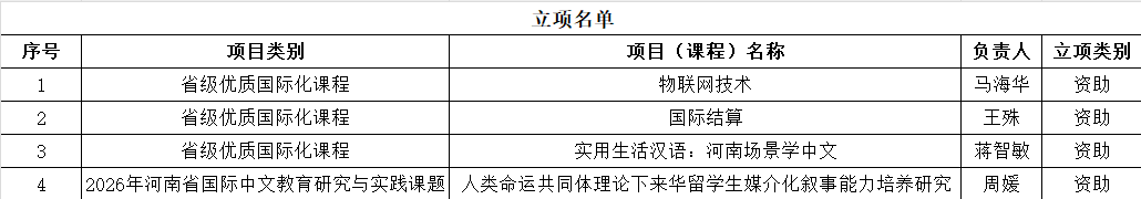 近日,河南省教育厅发布一批省级优质国际化课程、2026年河南省国际中文教育研究与实践课题、2026年河南省国际中文教育质量提升项目立项名单。其中,我校教师获批4项(见下表)。